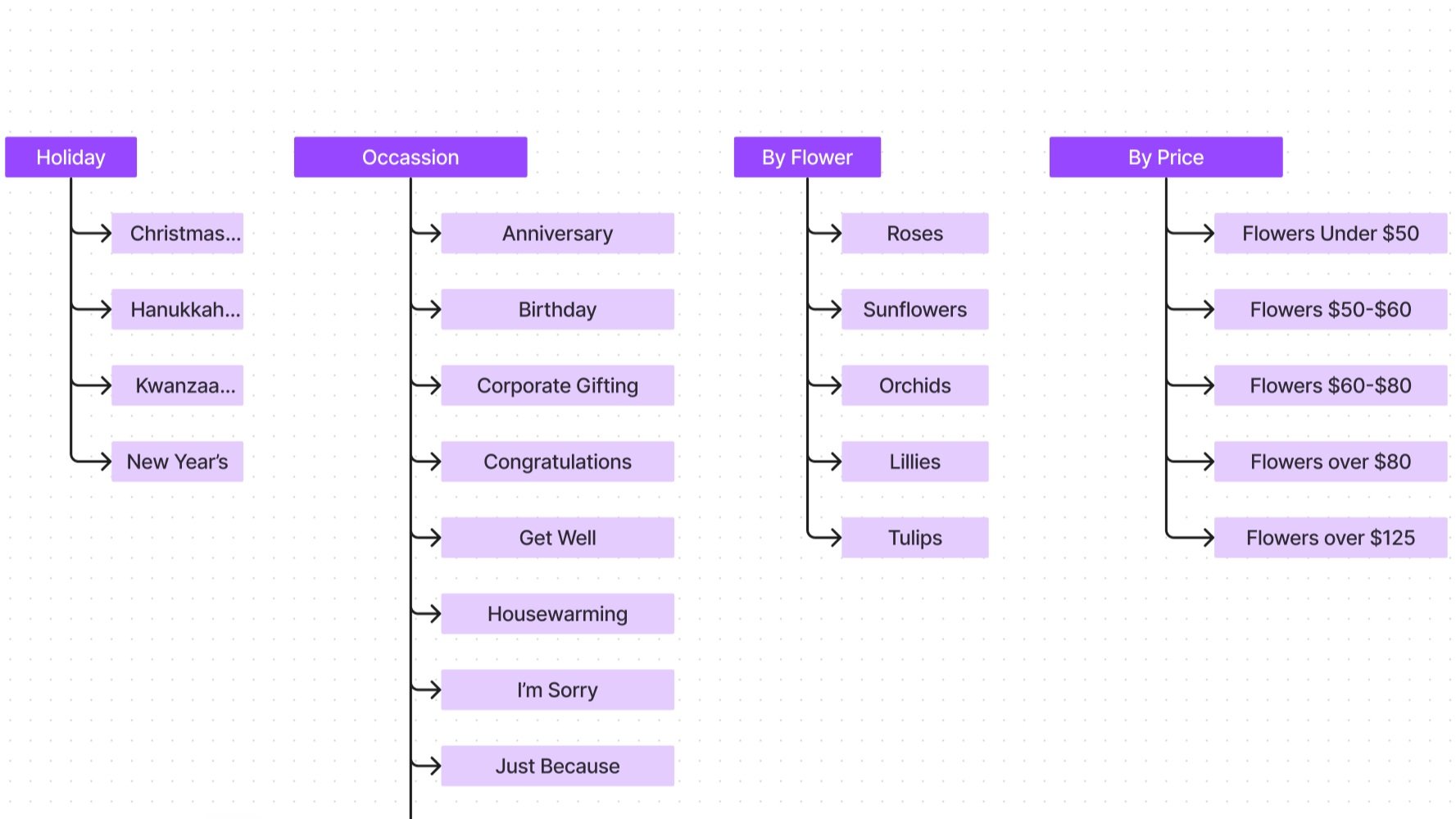 My process began with interviewing people who have purchased flowers and trying to understand their thought processes while shopping for flowers. I annotated their responses and sorted them to find any patterns. Below are the main findings from those interviews.